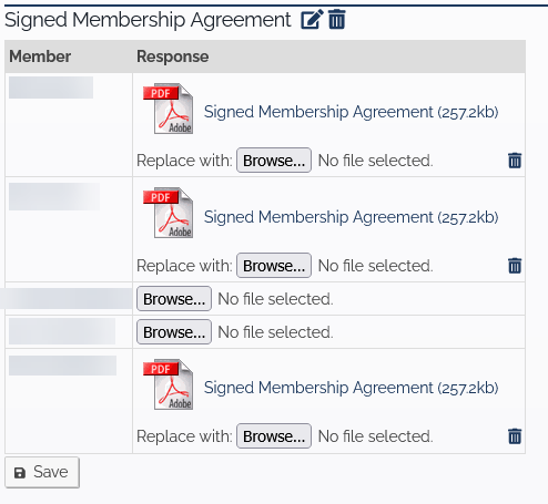 It's done using the "Member Audits" system. As you may recall, the Member Audits system is a means for storing information about each member that the standard member database doesn't have a spot for, such as "shoe size", "dietary limitations", etc. Each "audit" can be thought of as one question, or one piece of information collected about each member. Responses to such questions could be free text, multiple choice, etc. Now, there's a NEW type of response: An uploaded file...