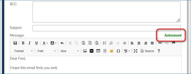 Geordie has fixed all that. Now, every word of text you type into the body of the email on the "Send Email" page is auto-saved every couple of seconds. You can see that in action here...