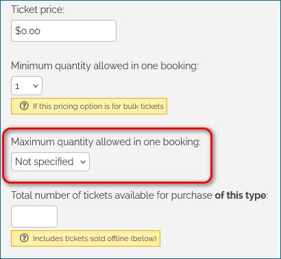 When creating event ticket pricing records (e.g. "Adult" ticket for "General seating" = $25), it has always been possible to specify the minimum number of tickets that must be purchased in one transaction. Now it's possible to specify a maximum number of tickets in one transaction...