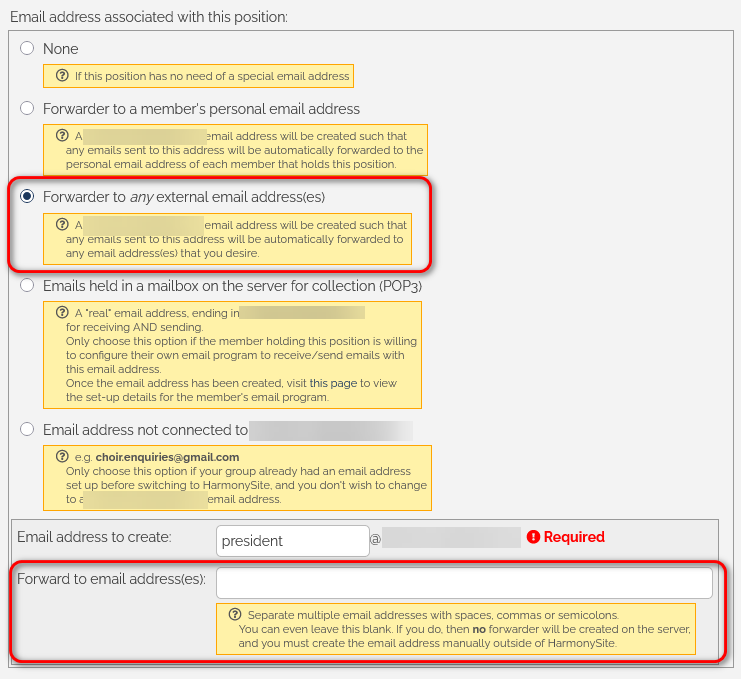 It's even possible for no automatic forwarding to happen at all. In this situation, the email address you create (e.g. president@mygroup.com) is simply displayed on the "Officers" page against the position. It is up to you to (somehow) create that email address yourself, perhaps in an external email system.