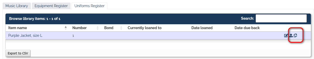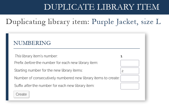 For each item that you loan out (e.g. a copy of printed sheet music, or a "purple jacket size L", etc) you often have MANY of them, all the same. The only difference between each is that you've numbered each one. For example, if you had 20 purple jackets, you would likely have written the numbers 1 through 20 on the TAG of the jacket. So you need 20 identical items in the library database - the only difference between each one being the NUMBER (1-20). Up until now, each of the 20 database records would have needed to be added MANUALLY (big job!). Now, you can click the icon circled in red below to create multiple copies at once...