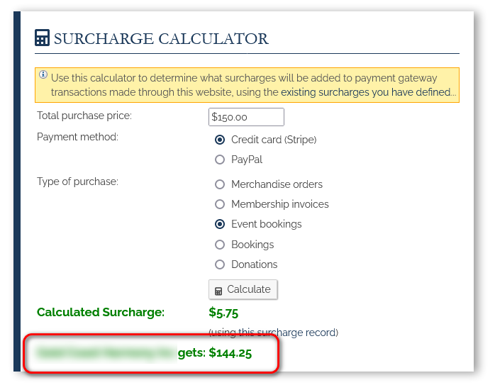 We've also created a couple of useful surcharge calculators for you to play with, both found by clicking the "Payment Surcharge Calculator" link on the "Financials" line of your Admin Dashboard...
