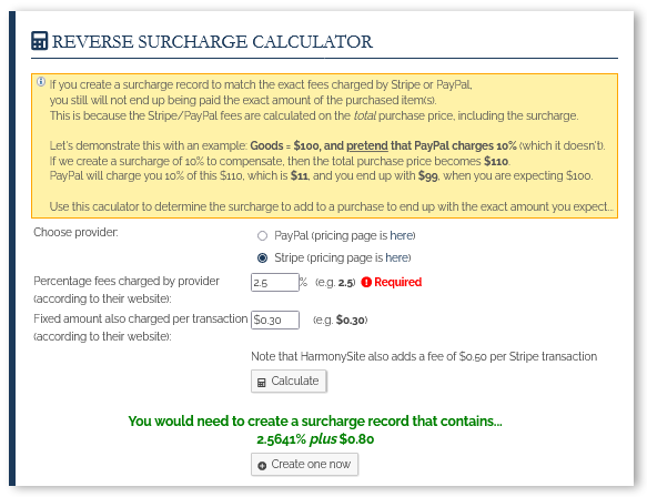As you may know, HarmonySite uses two payment gateways for processing credit card (and other) payments for items purchased through your HarmonySite: Stripe and PayPal. These payment gateways charges fees, usually around 3%, meaning that if you sell something through your HarmonySite for (say) $100, you'll only end up with around $97. To compensate for this HarmonySite has allowed you to configure a percentage surcharge to compensate, so that the purchaser would end up paying (say) $103, and you'd end up with something closer to your original $100.