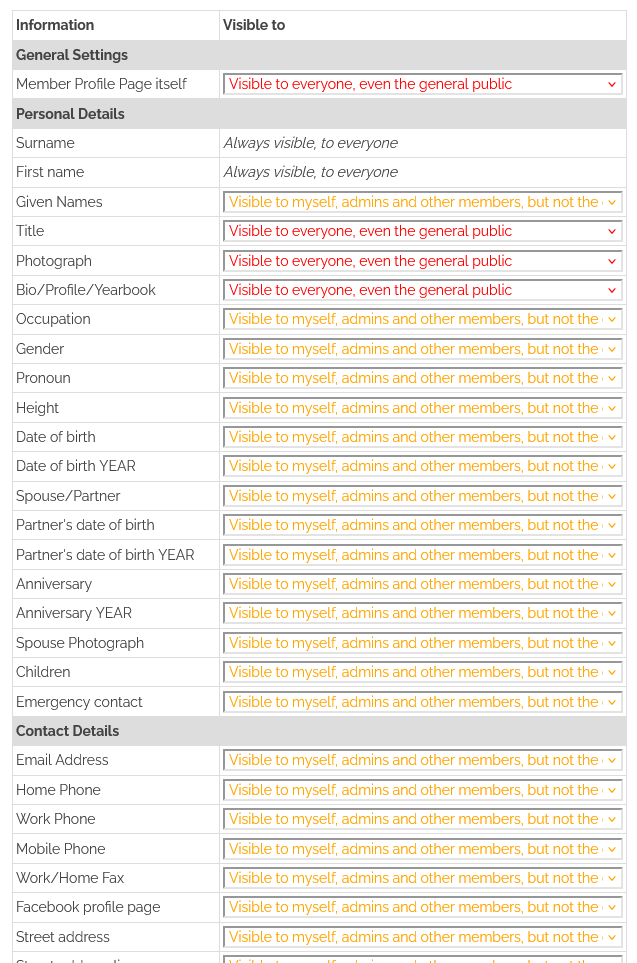 We have received many requests over the years asking if there was some way for members to be able to hide their email address, or phone numbers, or home address, etc from other members. Some people wanted ALL details hidden, others only wanted SOME details hidden. And often it was only SOME members that wanted their details hidden, while others were happy to have all details shown to other members. This new feature allows you to tailor member privacy however you want it.
