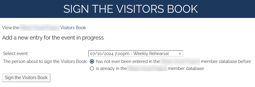 HarmonySite has always had a "Visitors Book", but it was never publicised as a feature, because it wasn't working properly. That's been fixed now, so we can let you know it's there, if you want it. It's a way to record visitors that may have come to your rehearsals or other events. It captures their details, and adds them to the "member" database, as a "Visitor", and marks them as having attended that event (as a visitor). With their details in the member database, it's easy to later convert them from a "Visitor" to a "Member", if they ever decide to join your group, or you want their email address for your mailing list, etc.