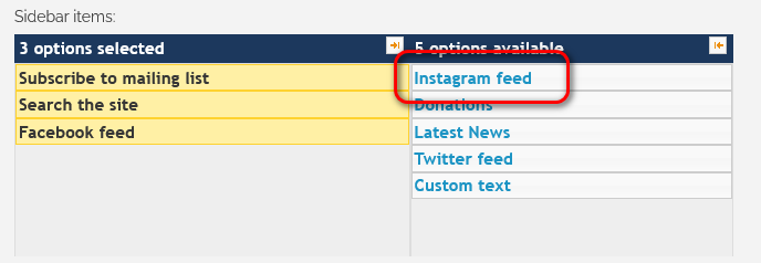To add the Instagram feed to your sidebar, click once on it in the right-hand column, which will move it across to the left-hand side (meaning it will be shown in your sidebar). You can then drag it up or down to position it correctly with respect to the other "widgets" listed on the left-hand side. Be sure to save your changes.