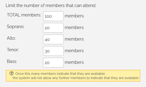 So now, when a member attempts to indicate their availability, the system checks TWO limits: The "TOTAL" limit, and the limit for their voice part. If EITHER limit is reached, the member's attempt to register for the event will not be accepted.