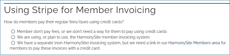 There's an existing page in your HarmonySite for connecting to the Stripe payment gateway (so that you can accept credit card payments for tickets, invoices, orders, donations, etc). You can find that page by clicking the link called "Connect to Stripe Payment Gateway", in the "Financials" section of your Admin Dashboard. AFTER you have connected to Stripe, that same page will now show the following new section...